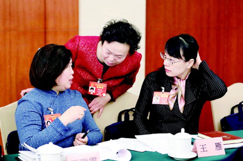 山東代表團代表胡桂花(中)、王瑞霞(左)、王雁,討論支持民營企業(yè)發(fā)展的政策舉措如何落地落實。(轉(zhuǎn)自《大眾日報》手機客戶端)