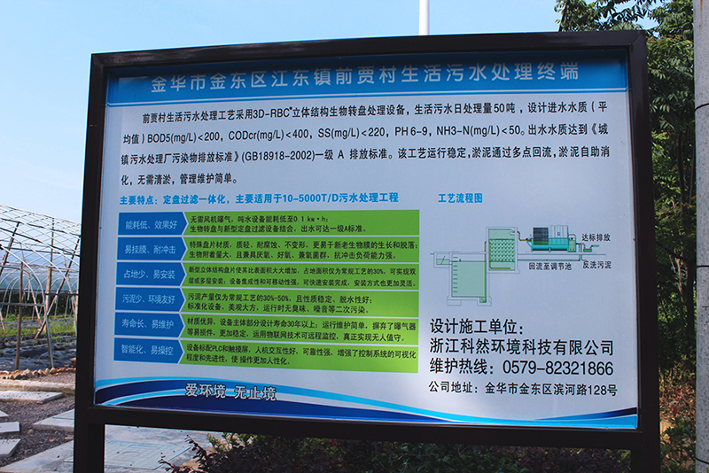 金華市江東鎮前賈村生活污水處理工藝采用3D-RBC立體結構生物轉盤處理設備,生活污水日處理量50噸,